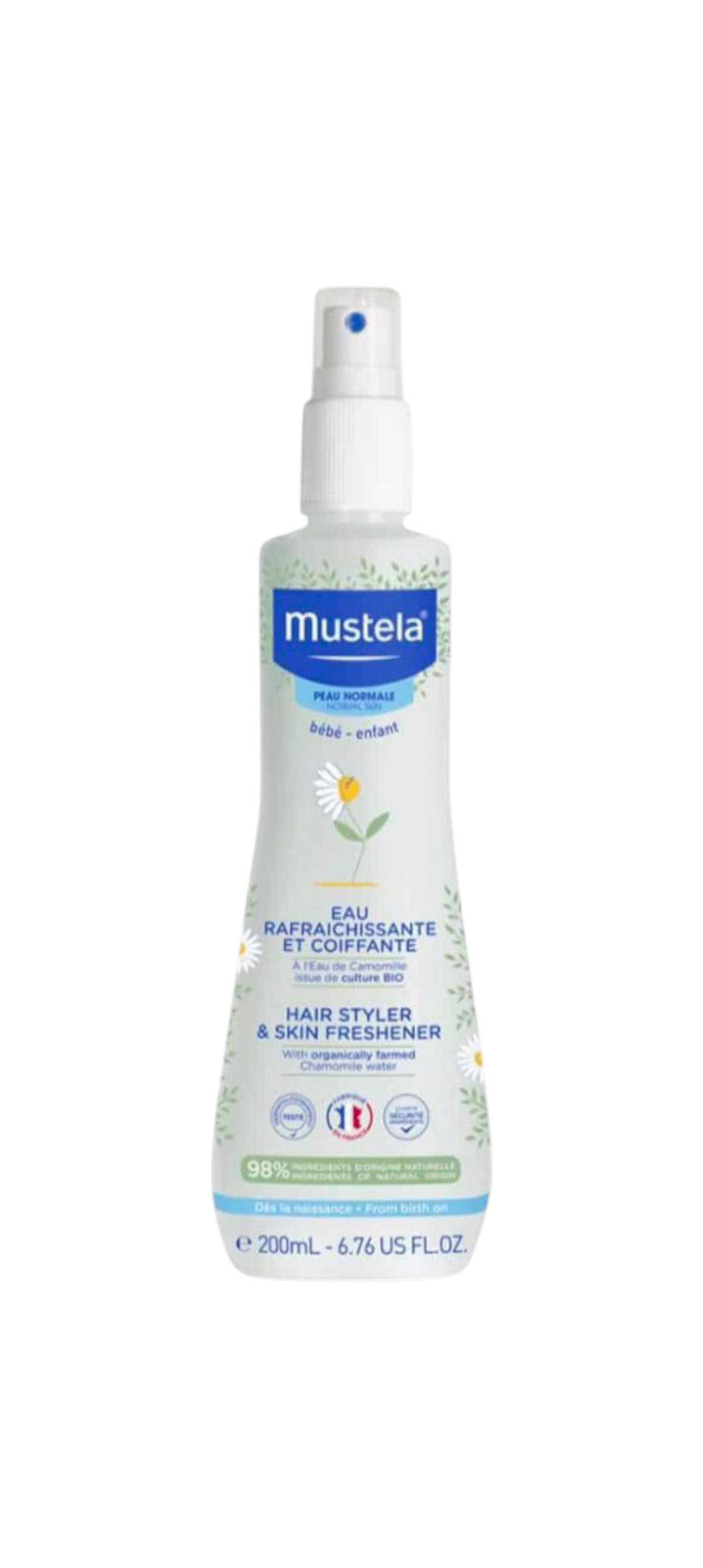 Spray rafraîchissant et coiffant Mustela à l’eau de camomille bio ! Idéal pour coiffer les cheveux de bébé tout en rafraîchissant sa peau. Formule douce et sûre dès la naissance, avec 98 % d’ingrédients d’origine naturelle.